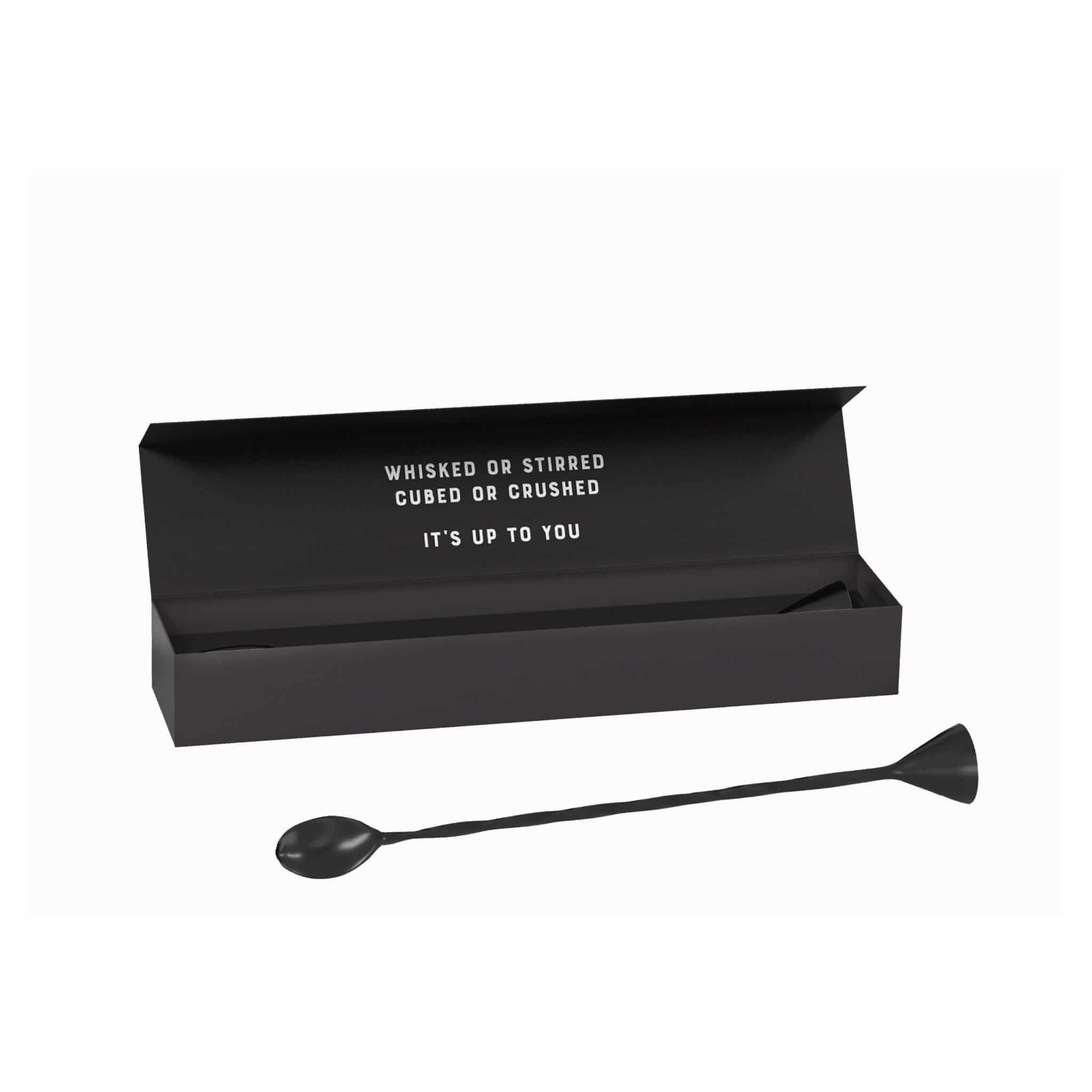 Profesjonell drinkskje i svart metall - et must for drink eksperter! Super til å røre drinker i høye mikseglass og longdrink glass. Den butte enden kan også brukes til å knuse mynte og sukker.