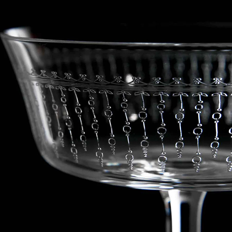 Fizzio 1920 Coupe Glass gir et vintage preg på drikkeserveringen din. Laget av blyfri krystall, har dette stykket av stilkgods en høy gjennomsiktighet. Rundt bollen er et mønster som etterligner bevegelsen av bobler i en sprudlende drink. Som slike er dette glasset ideelt for bruk som champagnefett, eller for servering av cocktailer.